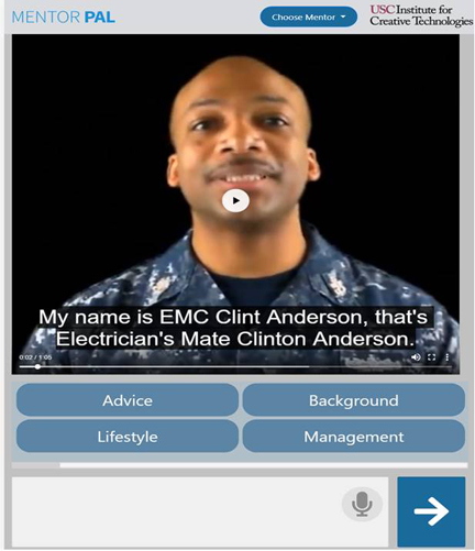 Solution: ICT proposes to create a scalable tablet-based app that gives students the opportunity to interact with a variety of STEM professionals from different fields and backgrounds. We plan to do this by building conversational virtual agents that emulate a question-and-answer session between students and STEM professionals who have current or prior Navy ties and are engaging, enthusiastic, and effective mentors. These interactions will allow students to have a life-like informational interview with virtual agent whose responses are directly drawn from an interview with a real-life professional in that field. At least in real-life contexts, such interactions are known to be effective for increasing motivation, engagement, and career self-efficacy. The proposed research will design virtual human agents in the same role and evaluate their effectiveness. These agents will be designed using USC-ICT Virtual Humans, which support life-like agents with realistic facial expressions and gestures. While such agents have previously been used as virtual coaches, it has not yet been attempted to model career counseling agents on individual STEM professionals (a key innovation of this project). By building onto the Navy PAL3 platform for Navy life-long learning, Mentor-Pal should also be able to rapidly synchronize with emerging Navy STEM needs.
